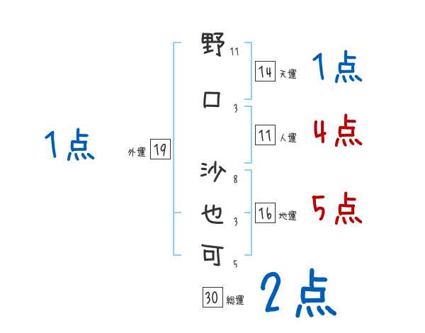 天運![]() | 野口沙也可さんの天運は14画の1つ星!人に対して優しいがストレスを溜め込みがち。人間関係のトラブルを避けるよう気をつけましょう。 家系が持つ宿命的な運勢を表します。祖先から受け継いだ苗字ですので自分の力が及びません。家柄を象徴します。 |