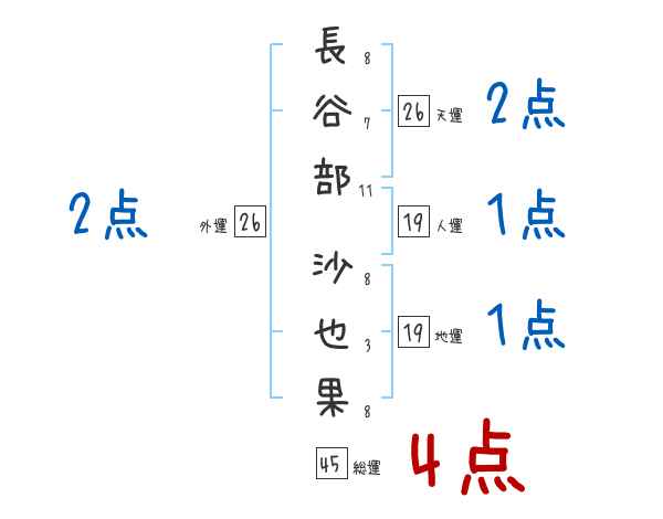 総運![]() | 長谷部沙也果さんの総運は45画の4つ星!もくもくと物事を進め達成する。地味な努力家。 あなたの人生を表す1番重要な運勢です。生涯を通じて影響する総合運となり、主に50歳以降の晩年期に影響を及ぼします。 |