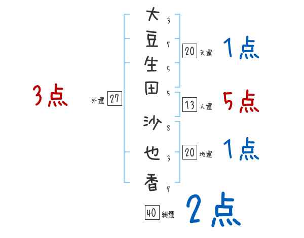 人運![]() | 大豆生田沙也香さんの人運は13画の5つ星!才能に恵まれ人気がある。名声を手に入れる。円満な人生。 性格や才能などを表す2番目に重要な運勢です。人間関係や協調性、社会的な成功に影響します。主に20歳から50歳ぐらいまでの中年期の運勢を表します。 |