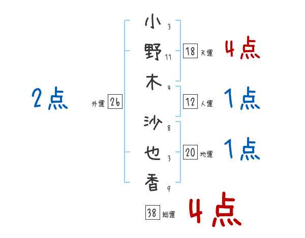 外運![]() | 小野木沙也香さんの外運は26画の2つ星!波瀾万丈かも。信頼できる人を大事にしましょう。 生活面を象徴する運勢です。外部から受ける影響力を表し、結婚運、家庭運や職場、環境への順応性を表します。 |