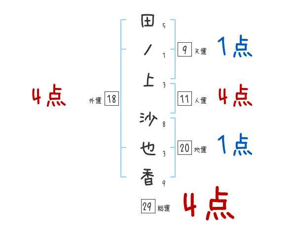 総運![]() | 田ノ上沙也香さんの総運は29画の4つ星!完全主義で才能がある。厳格な心の持ち主。 あなたの人生を表す1番重要な運勢です。生涯を通じて影響する総合運となり、主に50歳以降の晩年期に影響を及ぼします。 |