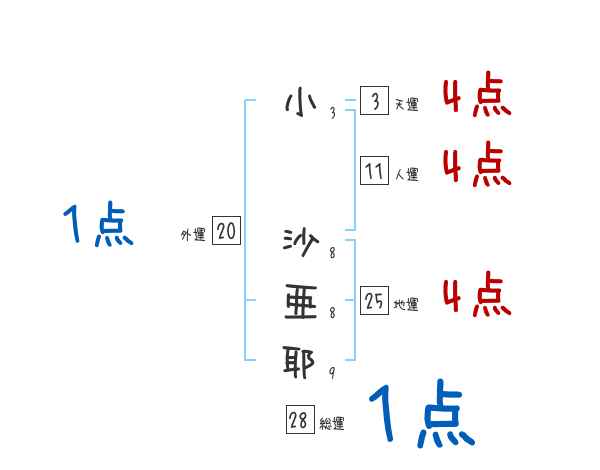 総運![]() | 小沙亜耶さんの総運は28画の1つ星!家庭環境に注意。スポーツで活躍できる能力があるかも。 あなたの人生を表す1番重要な運勢です。生涯を通じて影響する総合運となり、主に50歳以降の晩年期に影響を及ぼします。 |