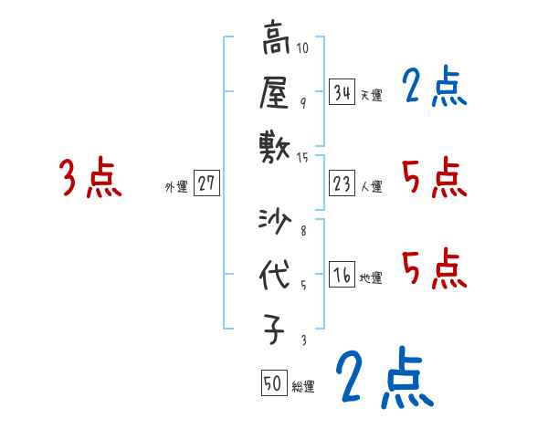 総運![]() | 高屋敷沙代子さんの総運は50画の2つ星!浮き沈みが激しく不安定。しりすぼみに衰退しやすいので注意しましょう。 あなたの人生を表す1番重要な運勢です。生涯を通じて影響する総合運となり、主に50歳以降の晩年期に影響を及ぼします。 |