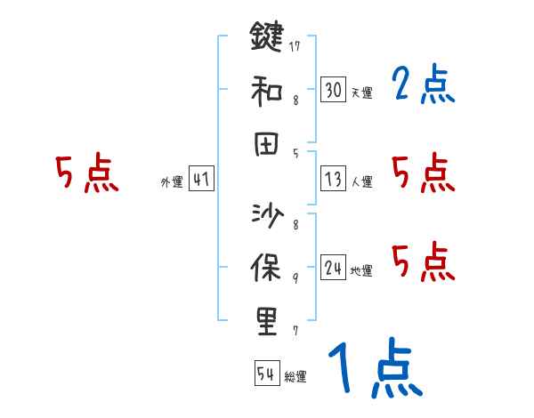 天運![]() | 鍵和田沙保里さんの天運は30画の2つ星!浮き沈みの激しさに注意しましょう。 家系が持つ宿命的な運勢を表します。祖先から受け継いだ苗字ですので自分の力が及びません。家柄を象徴します。 |