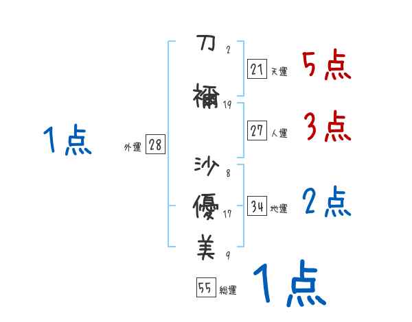 外運![]() | 刀禰沙優美さんの外運は28画の1つ星!家庭環境に注意。スポーツで活躍できる能力があるかも。 生活面を象徴する運勢です。外部から受ける影響力を表し、結婚運、家庭運や職場、環境への順応性を表します。 |