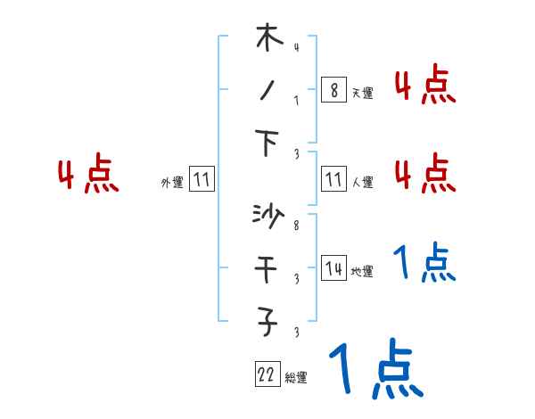 天運![]() | 木ノ下沙千子さんの天運は8画の4つ星!勤勉家。根気強く努力し成功する。忍耐力がある。 家系が持つ宿命的な運勢を表します。祖先から受け継いだ苗字ですので自分の力が及びません。家柄を象徴します。 |