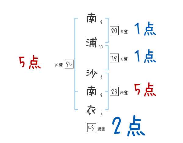 外運![]() | 南浦沙南衣さんの外運は24画の5つ星!家庭運が良く順調な人生。金運にも恵まれる。 生活面を象徴する運勢です。外部から受ける影響力を表し、結婚運、家庭運や職場、環境への順応性を表します。 |