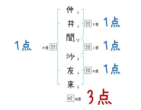 総運![]() | 仲井間沙友来さんの総運は42画の3つ星!病気に注意。多芸であるが消極的でおとなしい。 あなたの人生を表す1番重要な運勢です。生涯を通じて影響する総合運となり、主に50歳以降の晩年期に影響を及ぼします。 |
