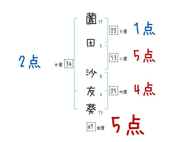 総運![]() | 薗田沙友葵さんの総運は47画の5つ星!実力が開花し発展する円満な人生。財に恵まれる。 あなたの人生を表す1番重要な運勢です。生涯を通じて影響する総合運となり、主に50歳以降の晩年期に影響を及ぼします。 |