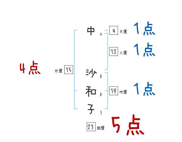 天運![]() | 中沙和子さんの天運は4画の1つ星!感情が不安定で苦労するかも。周囲との協調を心掛けましょう。 家系が持つ宿命的な運勢を表します。祖先から受け継いだ苗字ですので自分の力が及びません。家柄を象徴します。 |
