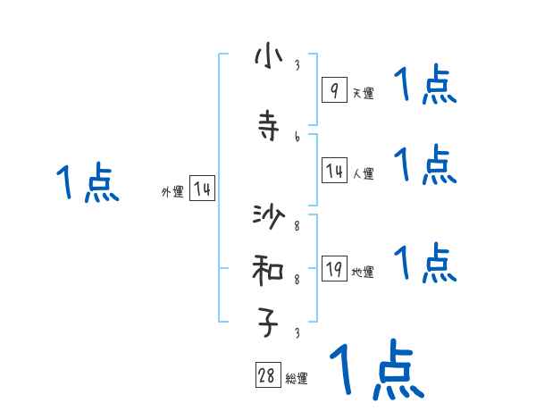 総運![]() | 小寺沙和子さんの総運は28画の1つ星!家庭環境に注意。スポーツで活躍できる能力があるかも。 あなたの人生を表す1番重要な運勢です。生涯を通じて影響する総合運となり、主に50歳以降の晩年期に影響を及ぼします。 |