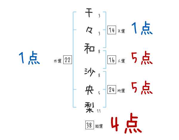 人運![]() | 千々和沙央梨さんの人運は16画の5つ星!人望が厚く大きく発展する。逆転成功が見える。 性格や才能などを表す2番目に重要な運勢です。人間関係や協調性、社会的な成功に影響します。主に20歳から50歳ぐらいまでの中年期の運勢を表します。 |