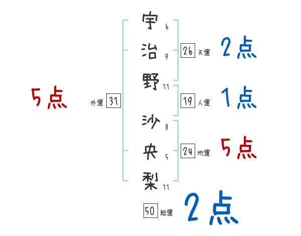 天運![]() | 宇治野沙央梨さんの天運は26画の2つ星!波瀾万丈かも。信頼できる人を大事にしましょう。 家系が持つ宿命的な運勢を表します。祖先から受け継いだ苗字ですので自分の力が及びません。家柄を象徴します。 |