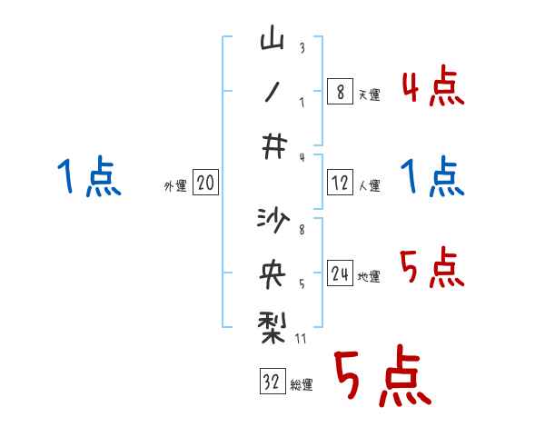 総運![]() | 山ノ井沙央梨さんの総運は32画の5つ星!柔軟性があり成功する。チャンスが多く金運が良い。 あなたの人生を表す1番重要な運勢です。生涯を通じて影響する総合運となり、主に50歳以降の晩年期に影響を及ぼします。 |