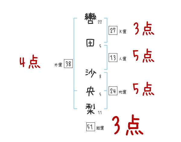 外運![]() | 轡田沙央梨さんの外運は38画の4つ星!温厚な性格で技術的な才能を発揮する。職人的な仕事に向いている。 生活面を象徴する運勢です。外部から受ける影響力を表し、結婚運、家庭運や職場、環境への順応性を表します。 |