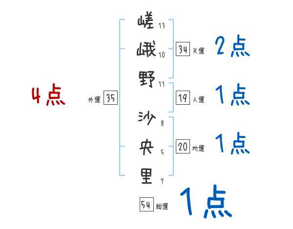 外運![]() | 嵯峨野沙央里さんの外運は35画の4つ星!温厚な性格で感受性が高い。穏和な性格で人望が厚い。 生活面を象徴する運勢です。外部から受ける影響力を表し、結婚運、家庭運や職場、環境への順応性を表します。 |