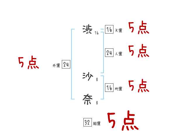総運![]() | 渋沙奈さんの総運は32画の5つ星!柔軟性があり成功する。チャンスが多く金運が良い。 あなたの人生を表す1番重要な運勢です。生涯を通じて影響する総合運となり、主に50歳以降の晩年期に影響を及ぼします。 |