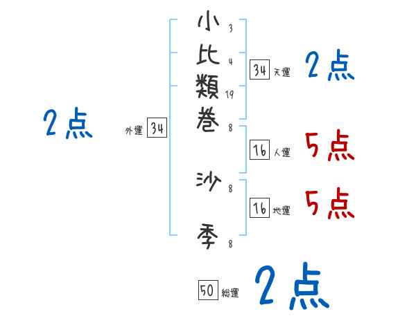 外運![]() | 小比類巻沙季さんの外運は34画の2つ星!独創性に優れるが、自尊心が強く災難に注意しましょう。 生活面を象徴する運勢です。外部から受ける影響力を表し、結婚運、家庭運や職場、環境への順応性を表します。 |