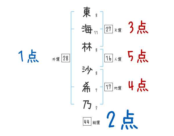 人運![]() | 東海林沙希乃さんの人運は16画の5つ星!人望が厚く大きく発展する。逆転成功が見える。 性格や才能などを表す2番目に重要な運勢です。人間関係や協調性、社会的な成功に影響します。主に20歳から50歳ぐらいまでの中年期の運勢を表します。 |