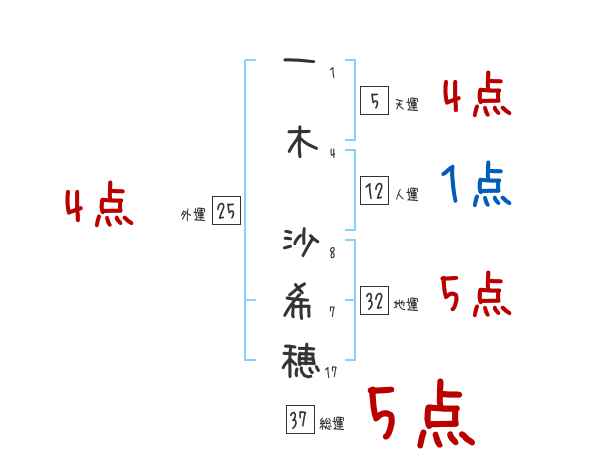 天運![]() | 一木沙希穂さんの天運は5画の4つ星!健康で安泰。協調性に優れ、財産に恵まれる。 家系が持つ宿命的な運勢を表します。祖先から受け継いだ苗字ですので自分の力が及びません。家柄を象徴します。 |