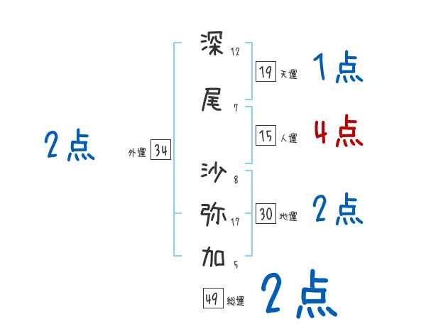 | 天運  | 深尾沙弥加さんの天運は19画の1つ星!優れた才能を持ちますが、協調性が足りないことも。周りの人と協力する事を意識しましょう。家系が持つ宿命的な運勢を表します。祖先から受け継いだ苗字ですので自分の力が及びません。家柄を象徴します。 |