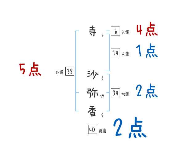 外運![]() | 寺沙弥香さんの外運は32画の5つ星!柔軟性があり成功する。チャンスが多く金運が良い。 生活面を象徴する運勢です。外部から受ける影響力を表し、結婚運、家庭運や職場、環境への順応性を表します。 |
