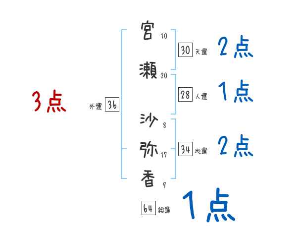 外運![]() | 宮瀬沙弥香さんの外運は36画の3つ星!先見性が豊かです。多少神経質で苦労することも。 生活面を象徴する運勢です。外部から受ける影響力を表し、結婚運、家庭運や職場、環境への順応性を表します。 |