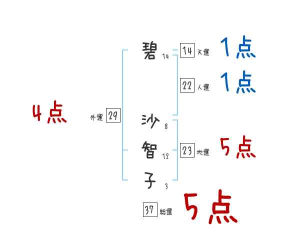 天運![]() | 碧沙智子さんの天運は14画の1つ星!人に対して優しいがストレスを溜め込みがち。人間関係のトラブルを避けるよう気をつけましょう。 家系が持つ宿命的な運勢を表します。祖先から受け継いだ苗字ですので自分の力が及びません。家柄を象徴します。 |