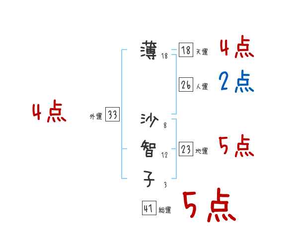 外運![]() | 薄沙智子さんの外運は33画の4つ星!権力志向でプライドが高い。勇気があり運を切り開き成功する。 生活面を象徴する運勢です。外部から受ける影響力を表し、結婚運、家庭運や職場、環境への順応性を表します。 |