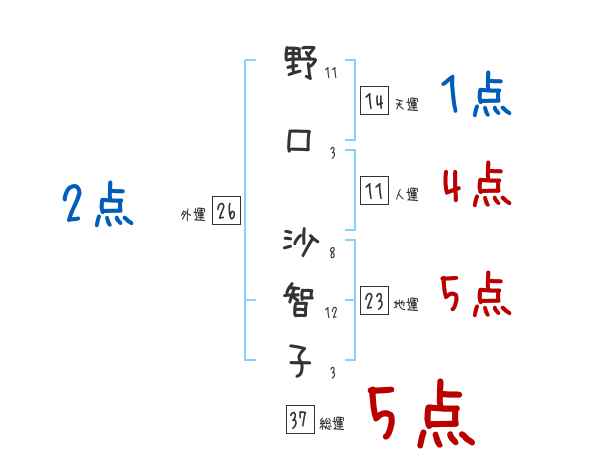 総運![]() | 野口沙智子さんの総運は37画の5つ星!努力家で順応性に優れる。現実的な考え方ができ忠実に物事をこなす。 あなたの人生を表す1番重要な運勢です。生涯を通じて影響する総合運となり、主に50歳以降の晩年期に影響を及ぼします。 |