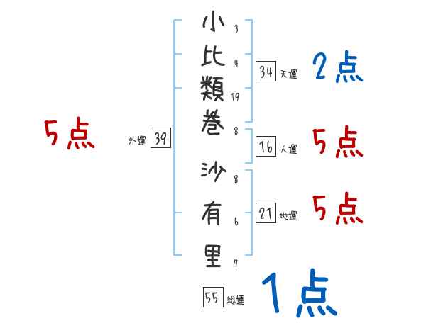 外運![]() | 小比類巻沙有里さんの外運は39画の5つ星!社交性に優れ人望が厚い。人の上に立ち成功する。 生活面を象徴する運勢です。外部から受ける影響力を表し、結婚運、家庭運や職場、環境への順応性を表します。 |
