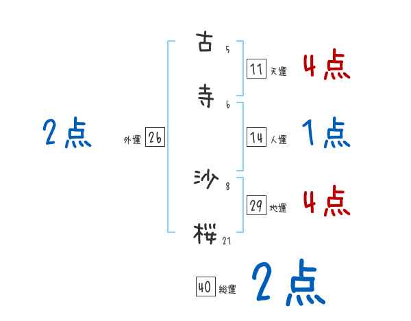 天運![]() | 古寺沙桜さんの天運は11画の4つ星!着実に富や地位を得る幸運な人生。 家系が持つ宿命的な運勢を表します。祖先から受け継いだ苗字ですので自分の力が及びません。家柄を象徴します。 |
