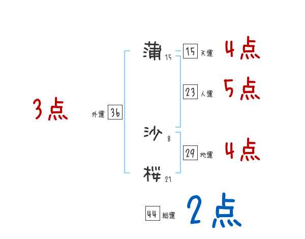 外運![]() | 蒲沙桜さんの外運は36画の3つ星!先見性が豊かです。多少神経質で苦労することも。 生活面を象徴する運勢です。外部から受ける影響力を表し、結婚運、家庭運や職場、環境への順応性を表します。 |