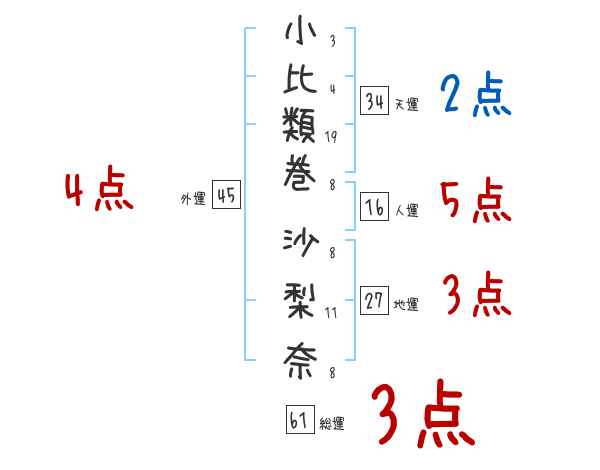 外運![]() | 小比類巻沙梨奈さんの外運は45画の4つ星!もくもくと物事を進め達成する。地味な努力家。 生活面を象徴する運勢です。外部から受ける影響力を表し、結婚運、家庭運や職場、環境への順応性を表します。 |