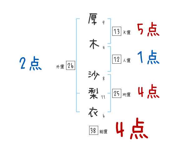 外運![]() | 厚木沙梨衣さんの外運は26画の2つ星!波瀾万丈かも。信頼できる人を大事にしましょう。 生活面を象徴する運勢です。外部から受ける影響力を表し、結婚運、家庭運や職場、環境への順応性を表します。 |