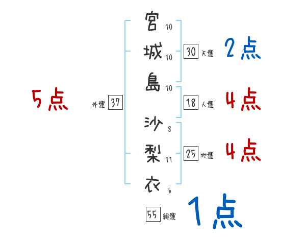 天運![]() | 宮城島沙梨衣さんの天運は30画の2つ星!浮き沈みの激しさに注意しましょう。 家系が持つ宿命的な運勢を表します。祖先から受け継いだ苗字ですので自分の力が及びません。家柄を象徴します。 |