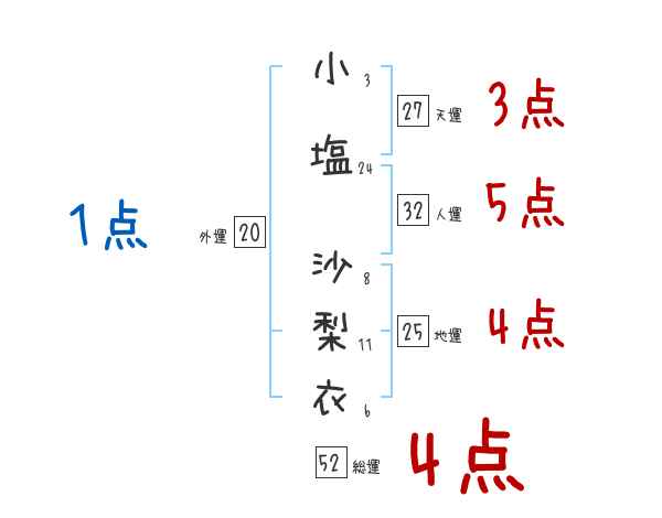 天運![]() | 小塩沙梨衣さんの天運は27画の3つ星!頭脳明晰だが強情で摩擦が多い傾向。孤立に注意。 家系が持つ宿命的な運勢を表します。祖先から受け継いだ苗字ですので自分の力が及びません。家柄を象徴します。 |