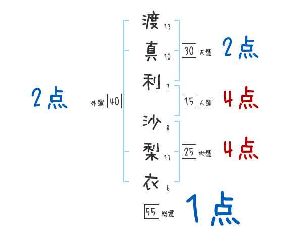 天運![]() | 渡真利沙梨衣さんの天運は30画の2つ星!浮き沈みの激しさに注意しましょう。 家系が持つ宿命的な運勢を表します。祖先から受け継いだ苗字ですので自分の力が及びません。家柄を象徴します。 |
