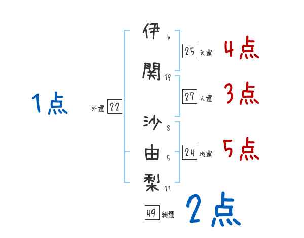 天運![]() | 伊関沙由梨さんの天運は25画の4つ星!個性があり才能があふれる。強運の持ち主で発展する。 家系が持つ宿命的な運勢を表します。祖先から受け継いだ苗字ですので自分の力が及びません。家柄を象徴します。 |