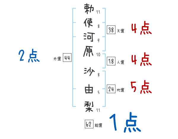 天運![]() | 勅使河原沙由梨さんの天運は38画の4つ星!温厚な性格で技術的な才能を発揮する。職人的な仕事に向いている。 家系が持つ宿命的な運勢を表します。祖先から受け継いだ苗字ですので自分の力が及びません。家柄を象徴します。 |
