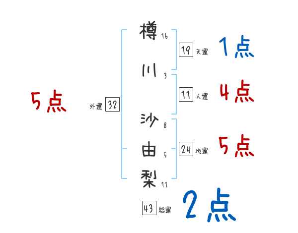 外運![]() | 樽川沙由梨さんの外運は32画の5つ星!柔軟性があり成功する。チャンスが多く金運が良い。 生活面を象徴する運勢です。外部から受ける影響力を表し、結婚運、家庭運や職場、環境への順応性を表します。 |