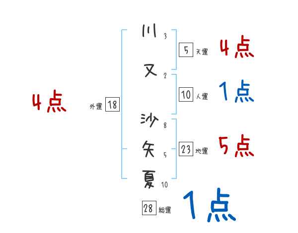 天運![]() | 川又沙矢夏さんの天運は5画の4つ星!健康で安泰。協調性に優れ、財産に恵まれる。 家系が持つ宿命的な運勢を表します。祖先から受け継いだ苗字ですので自分の力が及びません。家柄を象徴します。 |