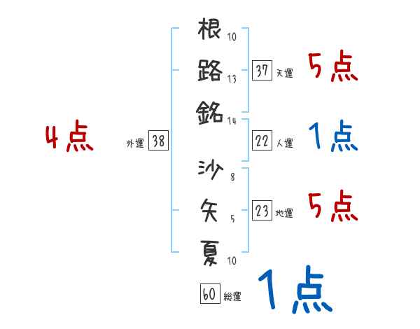 総運![]() | 根路銘沙矢夏さんの総運は60画の1つ星!悲観的で迷いやすい。波乱が多く損をしないように。 あなたの人生を表す1番重要な運勢です。生涯を通じて影響する総合運となり、主に50歳以降の晩年期に影響を及ぼします。 |