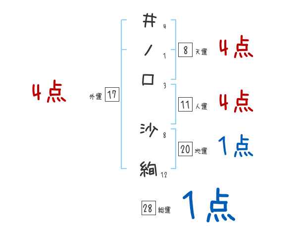 総運![]() | 井ノ口沙絢さんの総運は28画の1つ星!家庭環境に注意。スポーツで活躍できる能力があるかも。 あなたの人生を表す1番重要な運勢です。生涯を通じて影響する総合運となり、主に50歳以降の晩年期に影響を及ぼします。 |
