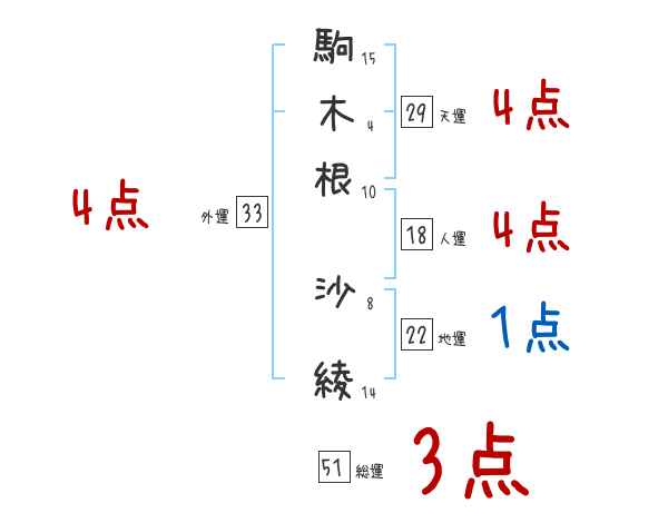 外運![]() | 駒木根沙綾さんの外運は33画の4つ星!権力志向でプライドが高い。勇気があり運を切り開き成功する。 生活面を象徴する運勢です。外部から受ける影響力を表し、結婚運、家庭運や職場、環境への順応性を表します。 |