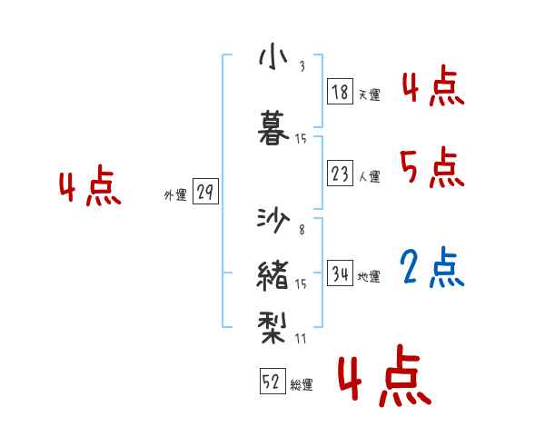 | 天運  | 小暮沙緒梨さんの天運は18画の4つ星!情熱的で剛気。忍耐力があり信頼される。家系が持つ宿命的な運勢を表します。祖先から受け継いだ苗字ですので自分の力が及びません。家柄を象徴します。 |