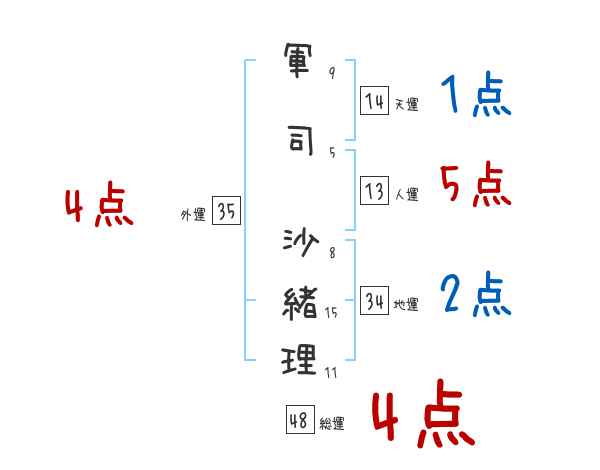 外運![]() | 軍司沙緒理さんの外運は35画の4つ星!温厚な性格で感受性が高い。穏和な性格で人望が厚い。 生活面を象徴する運勢です。外部から受ける影響力を表し、結婚運、家庭運や職場、環境への順応性を表します。 |