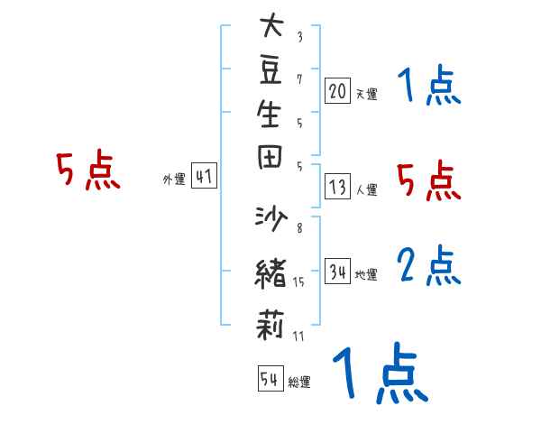 外運![]() | 大豆生田沙緒莉さんの外運は41画の5つ星!大志を抱き、目標に向かって実力を発揮し達成する。温和な性格。 生活面を象徴する運勢です。外部から受ける影響力を表し、結婚運、家庭運や職場、環境への順応性を表します。 |
