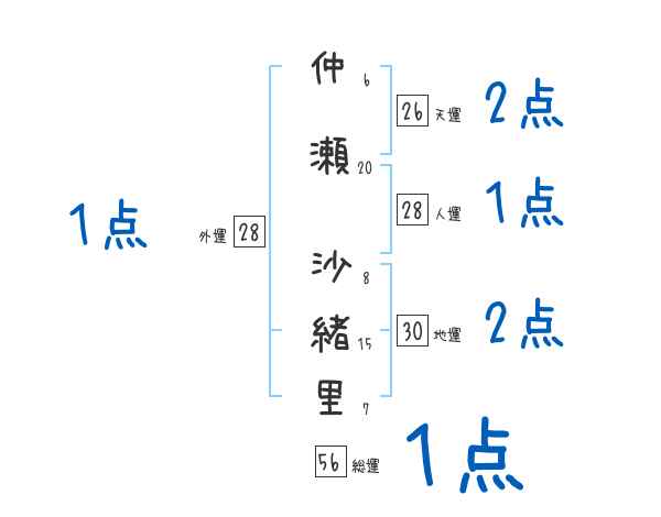 総運![]() | 仲瀬沙緒里さんの総運は56画の1つ星!消極的で無気力になりがち。誠実な気持ちが必要でしょう。 あなたの人生を表す1番重要な運勢です。生涯を通じて影響する総合運となり、主に50歳以降の晩年期に影響を及ぼします。 |
