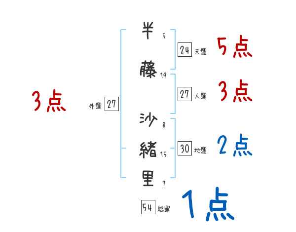 天運![]() | 半藤沙緒里さんの天運は24画の5つ星!家庭運が良く順調な人生。金運にも恵まれる。 家系が持つ宿命的な運勢を表します。祖先から受け継いだ苗字ですので自分の力が及びません。家柄を象徴します。 |